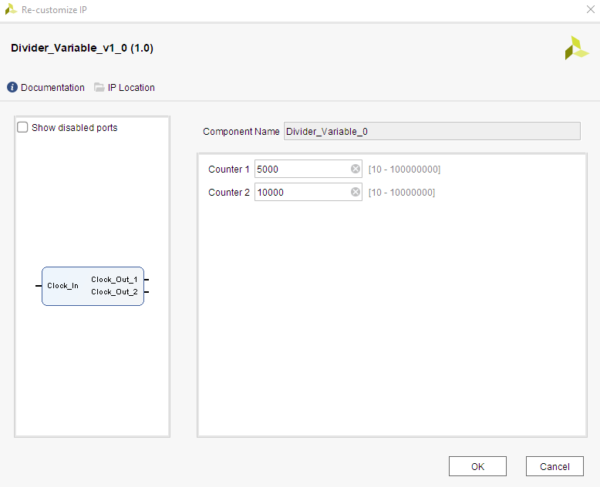The VHDL divider code basically works by counting the times a positive edge is present on the input clock. When the counters reach the value set by the user, the output clock logic state is inverted. This provides a division of the input clock frequency on the output clock.