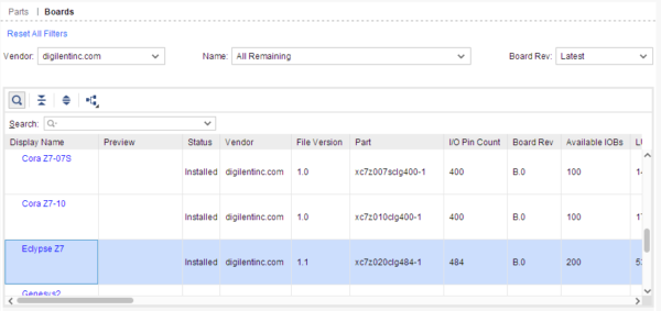 When the window to choose your device pops up, the vendor setting defaults to ‘digilentinc.com’ and the Eclypse Z7 board has been chosen. Make sure you have theDigilent板文件安装!