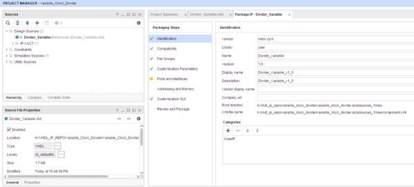 粘贴在本文末尾的VHDL代码是一个时钟分隔线的VHDL功能,其中一个时钟输入和两个时钟输出。在Vivado项目中创建的VHDL文件中,从Vivado的“工具”菜单中写入了代码后,已经选择了“创建和包装新IP”选项。在弹出窗口中,选择了“您当前项目的软件包”选项(图5)。这将把我们的Vivado项目打包成IP!